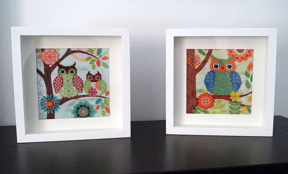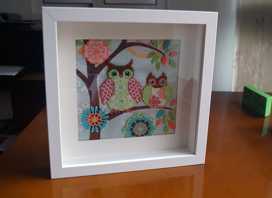 Y podéis adquirir kits en su tienda, de diferente estilo, temática y dificultad. Hay bordados completos en los que se borda toda la tela, que está impresa con el motivo. Y bordados parciales, en los que se bordan algunos motivos, con lo que se consigue un contraste muy bonito entre el volumen de la zona bordada con abalorios y el resto de la tela. Éstos son los que he hecho yo.