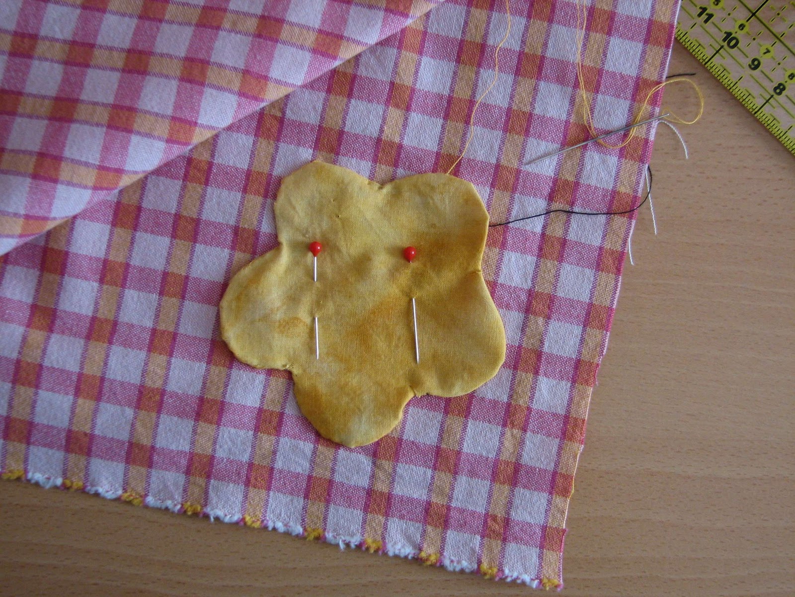 Next step depends on the appliqués shape: when it’s very round or has many curves make a few cuts to the fabric, iron wrapping the template and baste to keep the shape.