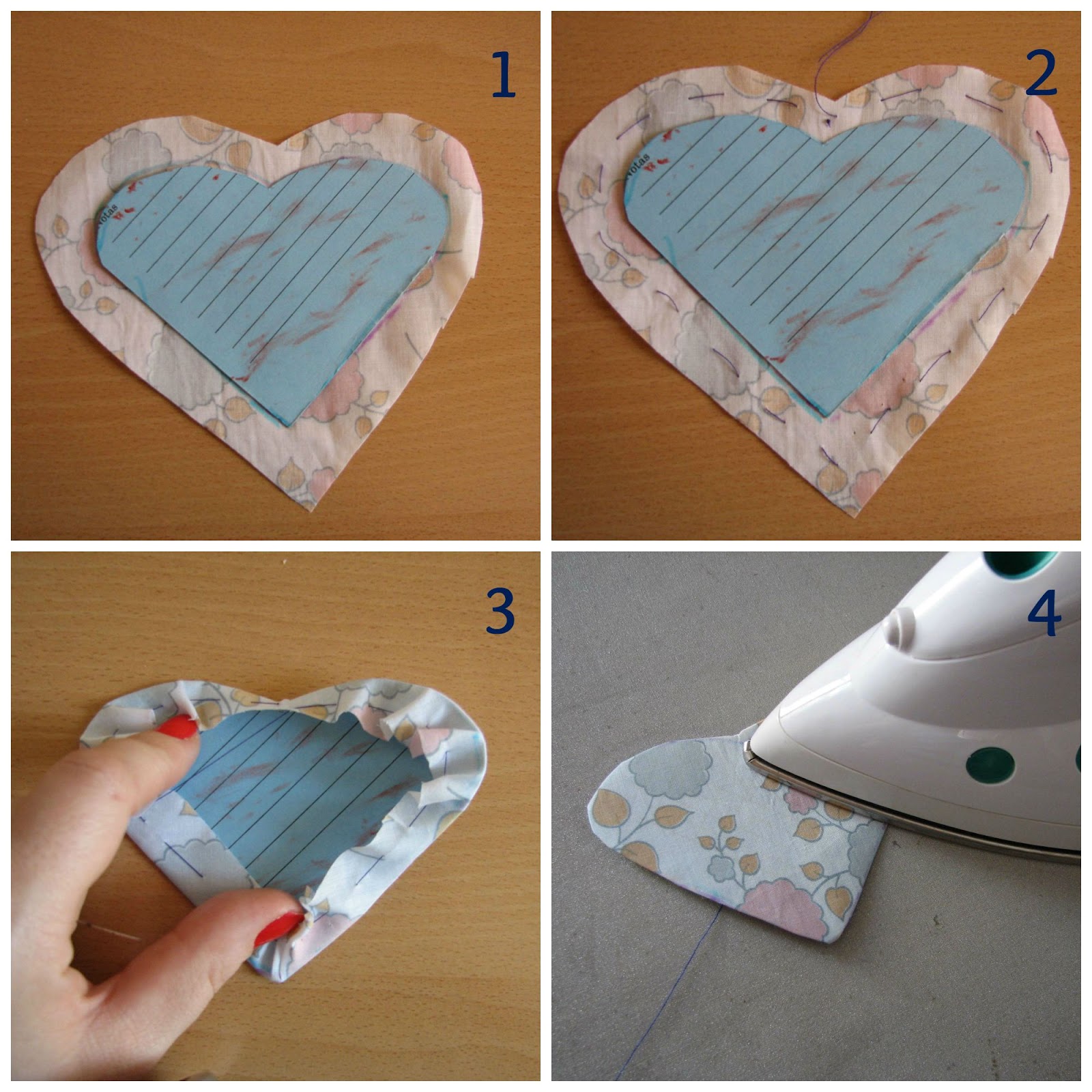El paso siguiente, varía dependiendo de la forma de la aplicación: cuando es muy redonda o tiene muchas curvas, se le da unos cortes a la tela, se plancha envolviendo la plantilla y se hilvana para mantener la forma.