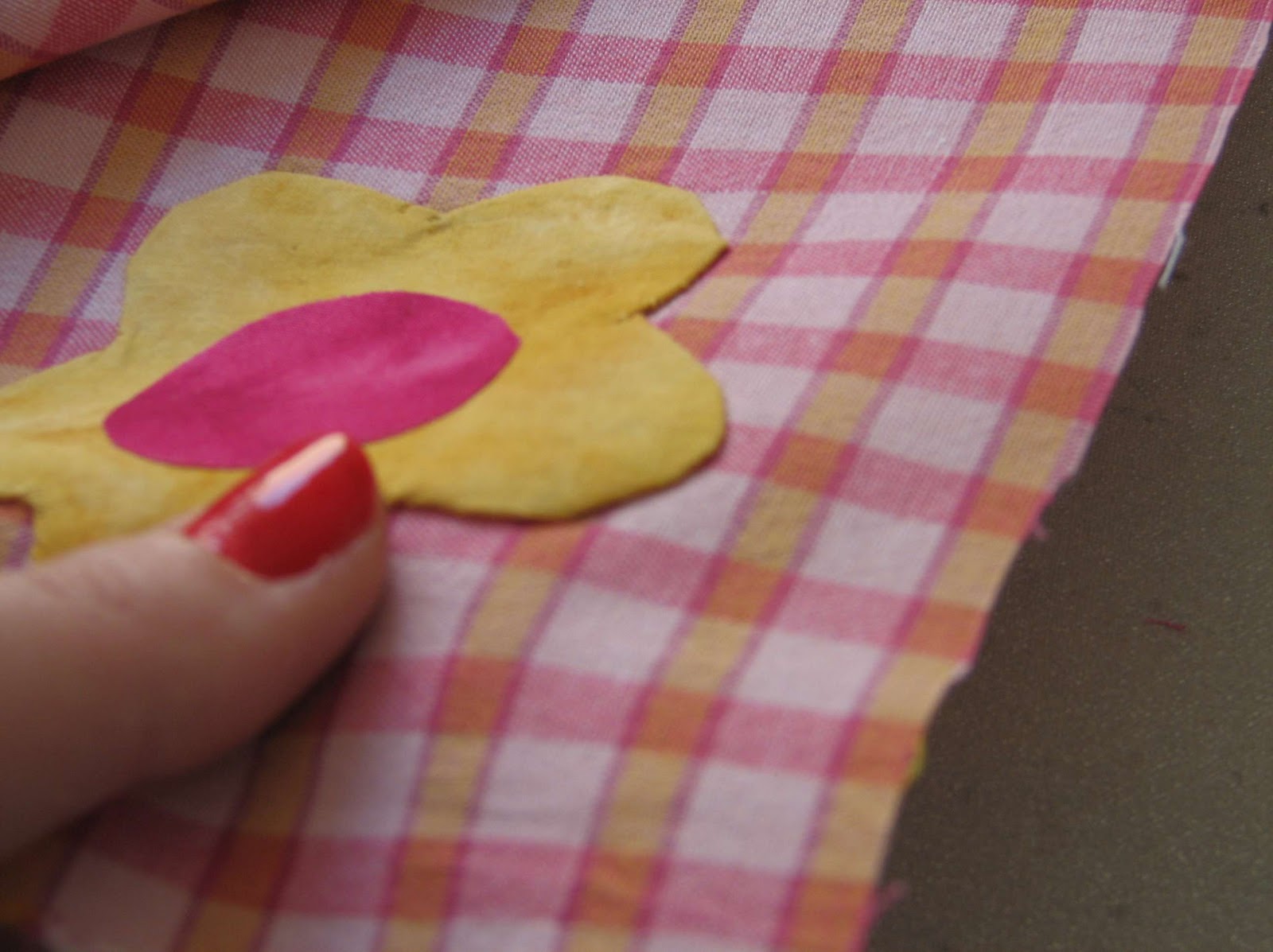 Existe una entretela especial para este tipo de aplicaciones que se llama freezer paper. Si la utilizamos, dibujaremos en su revés. Después colocamos la parte del freezer paper con pegamento sobre el revés de la tela y lo planchamos sin vapor.