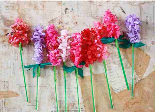Y para los niños unos jacintos de papel, ahora que los vemos en los jardines. El tutorial es de Aunt Peaches, que todos los viernes explica cómo hacer una flor de papel.