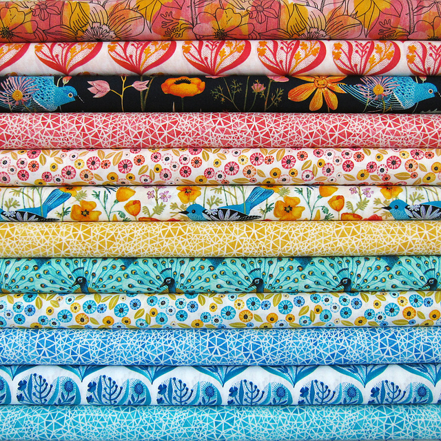 Geninne D. Zlatkis es una de mis ilustradoras favoritas, fue protagonista en el blog hace algún tiempo. Ahora ha sacado una maravillosa línea de telas para patchwork llamada Alegría. Se pueden adquirir en Cloud9 Fabrics.
