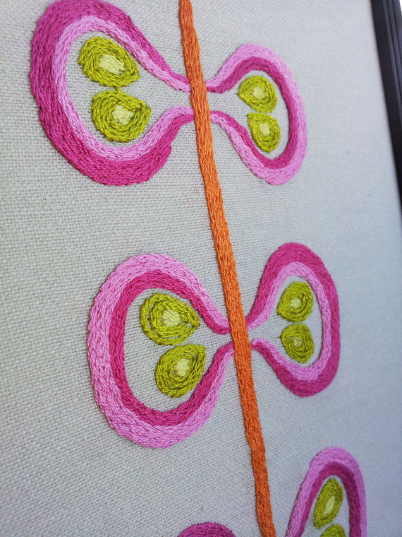 Modern and colorful embroideries by Rebecca Betancourt. She sells them at her shop on Etsy, Melys Hand-Embroidery.
