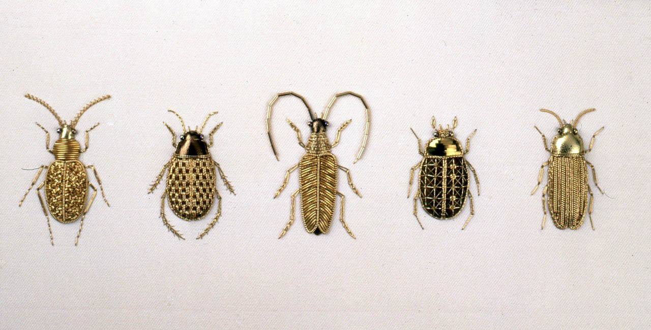 Insectos bordados con abalorios e hilo de oro por Jane Nicholas.
