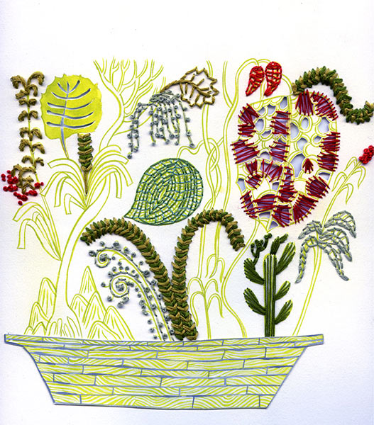Embroidery on paper looks a very delicate art to me. And Sarajo Frieden’s work spectacular. She is a very versatile artist: emboriders, paints and makes all kinds of structures and assemblies.