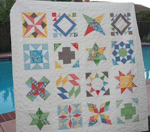 ¡Qué combinación de telas y que bloques tan bonitos! Un quilt perfecto. Su autora es Kate, cuyo blog, Swim, Bike,Quilt, me gusta mucho; es muy personal pero muy entretenido y cuelga fotos estupendas.