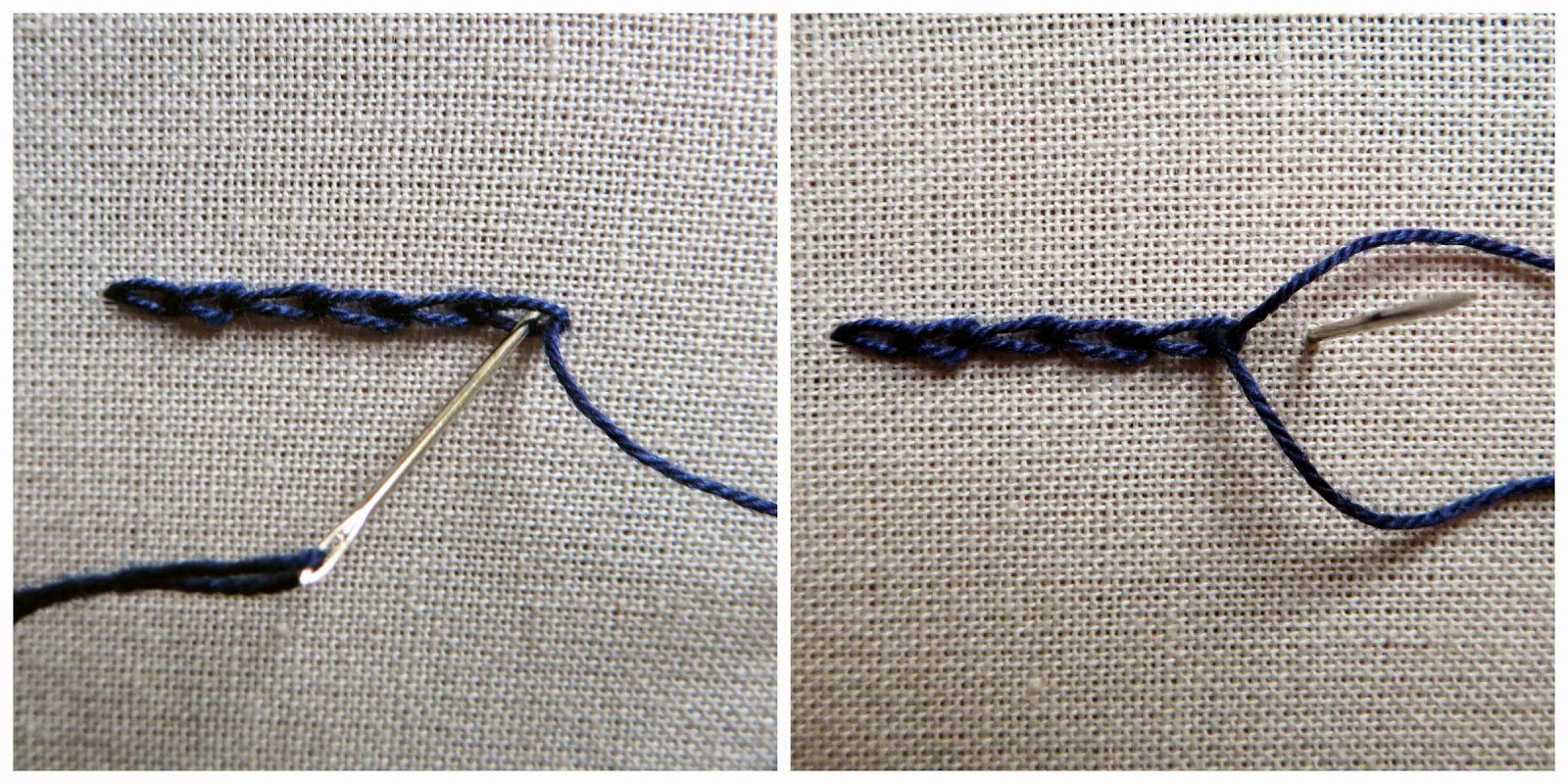 Placing the thread as in the drawing, push the needle through the fabric across the previous chain and keeping the stitch distance, pull it inside the «circle» formed with the thread before. Sew from left to right, with a soft and not twisted thread. And the best way to do it is the prick (to put the needle from up to down of the fabric with the hand we have on the fabric and to pull it up with the hand we have under the fabric).