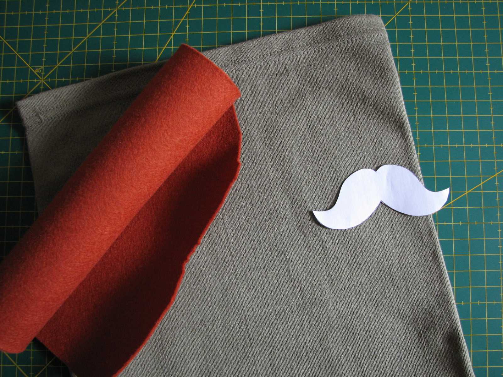 2– Pasamos el dibujo al fieltro, lo recortamos y lo colocamos sobre el cuello cuidando que quede bajo la nariz. Podemos sujetarlo con un alfiler o con pegamento especial para tela. A continuación lo cosemos al cuello a punto de festón.