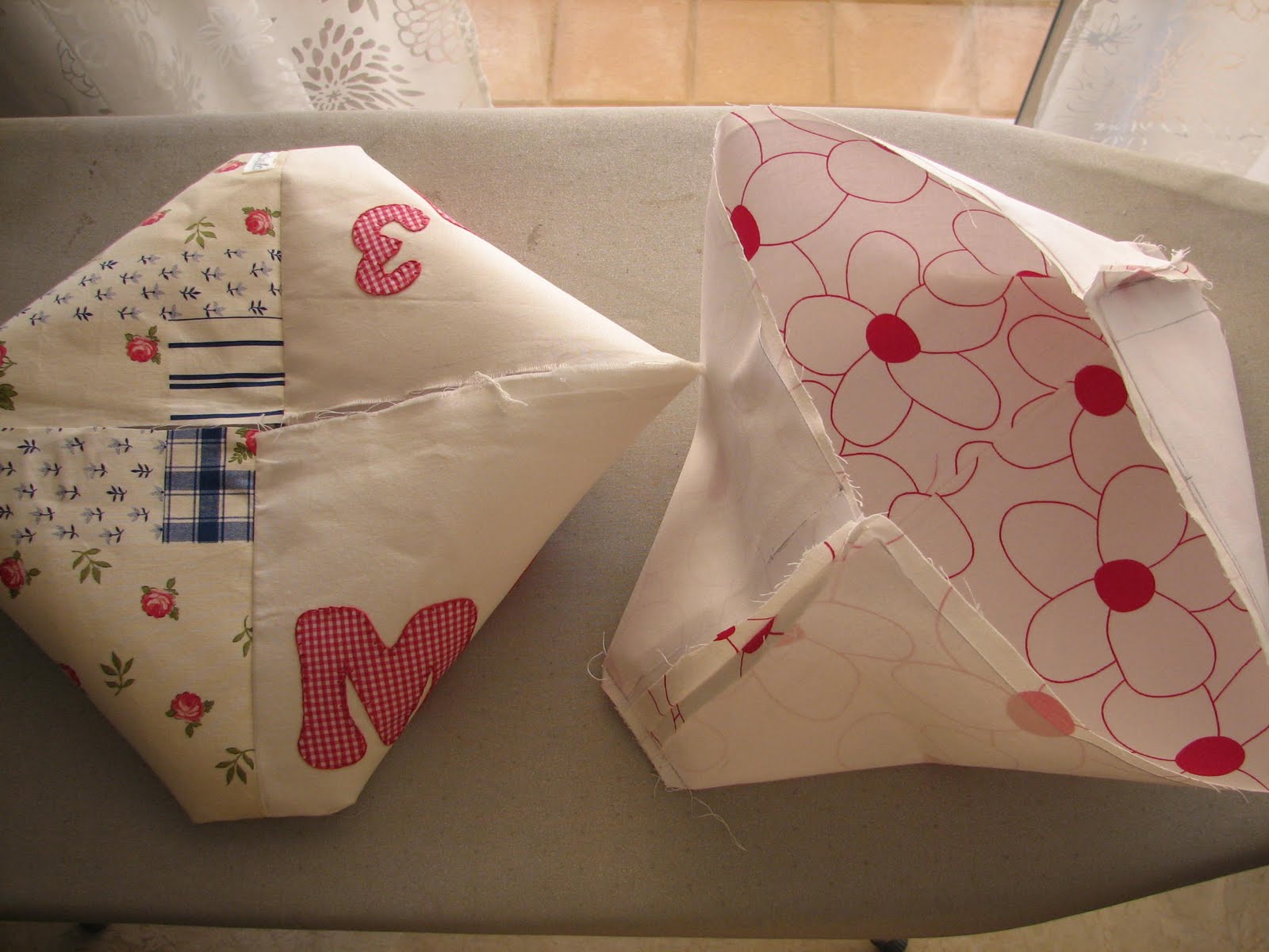 Next join the big pieces by one of the 16 in. edges, on one hand the outsides and on the other hand the lining pieces. Iron the seams well and put the interlining on the outside fabric (not on the lining).