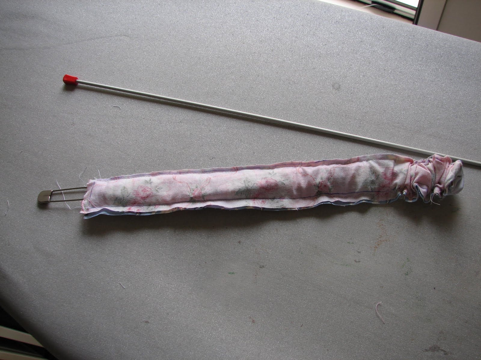 Por otro lado, se cosen las dos asas: se unen las dos caras a lo largo y se aplica entretela en un lado de cada asa después de planchar muy bien la costura. Se cose el otro lado de cada asa y se les da la vuelta para ponerlas del derecho. Os podéis ayudar con una aguja de tejer y un imperdible grande.