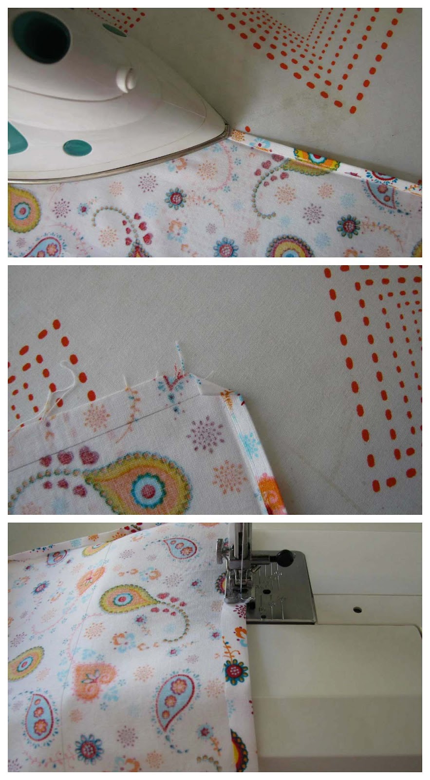2- Next iron the hem of the whole edge: fold the fabric twice on the long sides so that the edge of the fabric remains hidden and once on the short sides because when folding the flaps it will remain hidden. Fold the corners as in the photo. You can then sew the hem of the short sides.