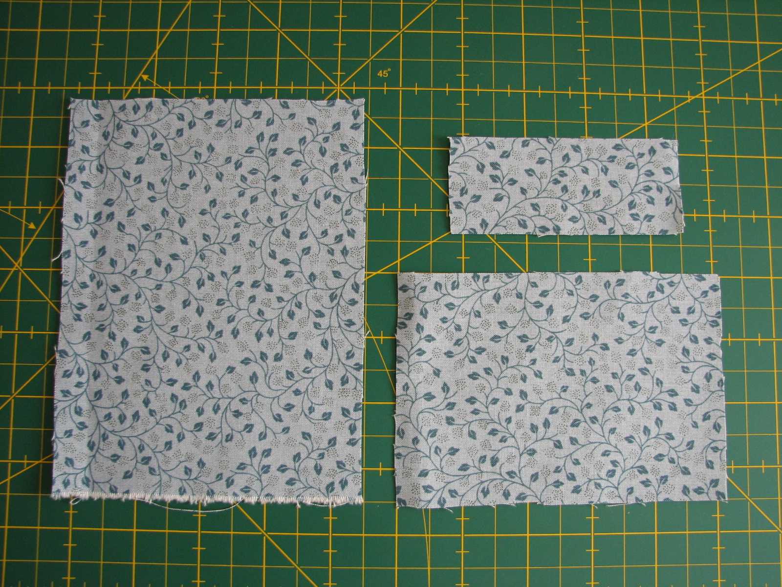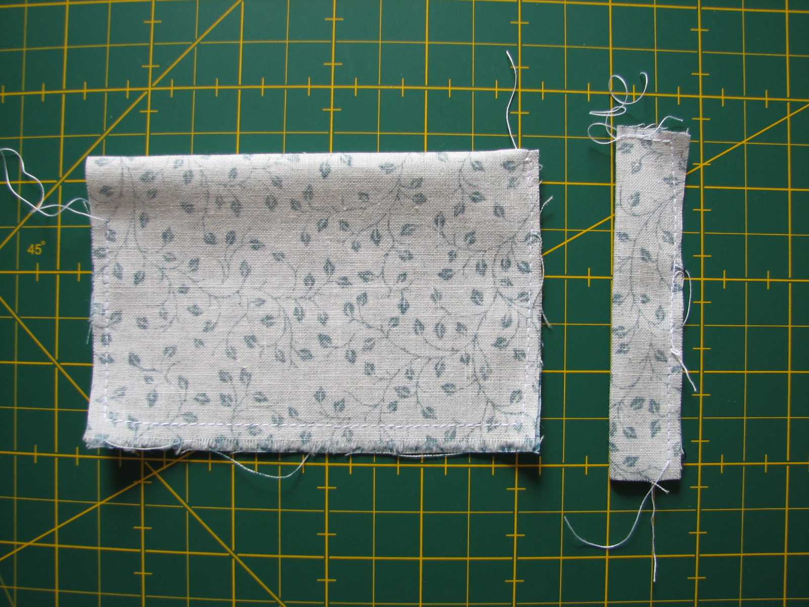 1- Cut two pieces of fabric: a rectangle of 6.3” X 4.3” and a strip of 2.4” X 1.6” (you can adapt these measurements as you prefer).