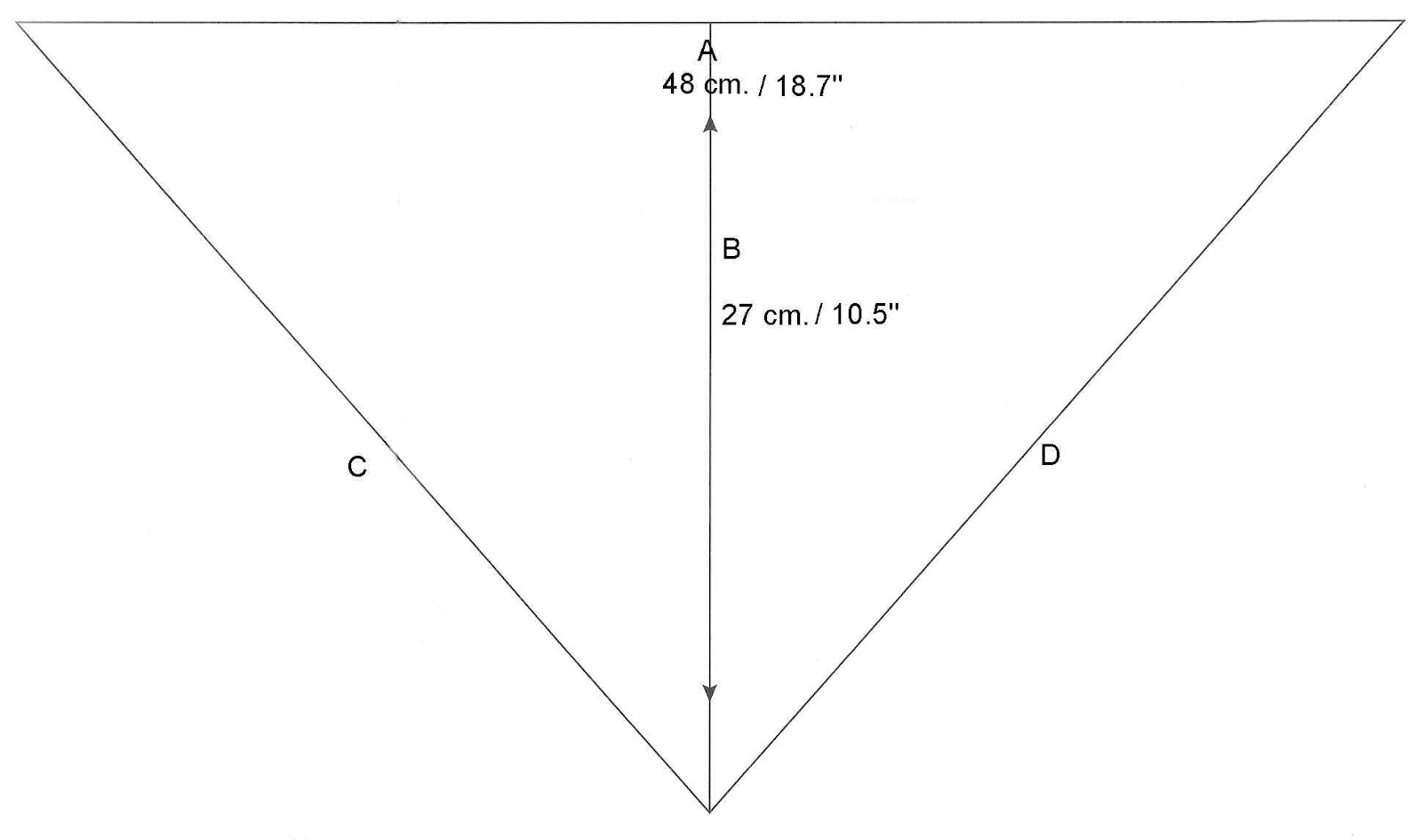 1- The measures depend on the head that will wear the headscarf, I’ve measured the diameter of the head of my daughter. You can calculate your meaures in proportion to mine. To draw the triangle I have drawn first line A and next line B perpendicularly from the central point of line A. Then I have joined the ends of both straight lines to draw lines C and D.