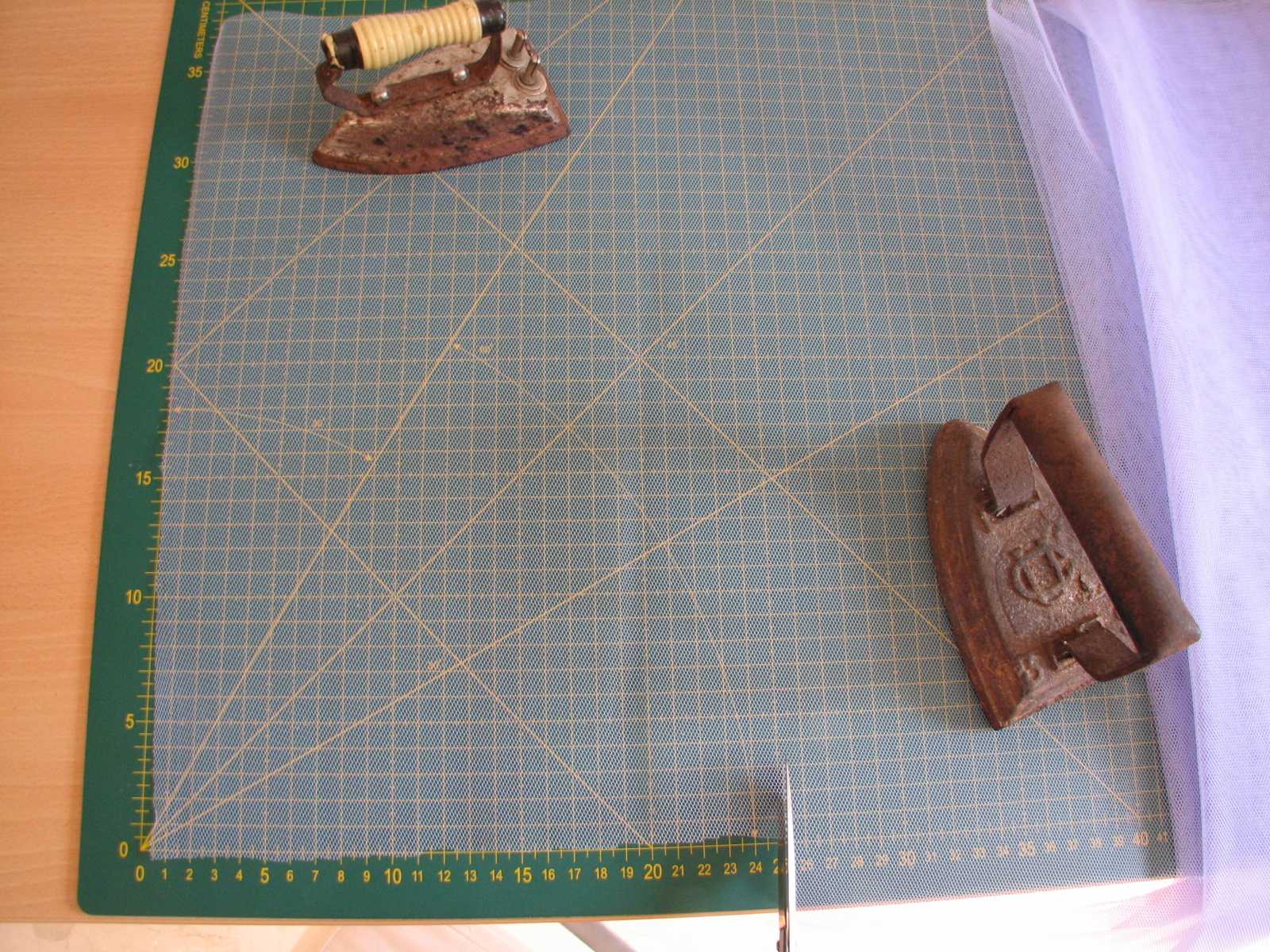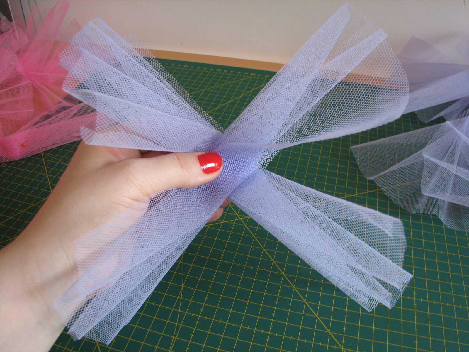 1– Para cada pompón cortamos ocho cuadrados de tul de 25 cm. x 25 cm. Como es difícil marcar en el tul, lo he puesto sobre la base de corte para recortarlo. Si no tenéis, lo mejor para dibujar sobre tul es la tiza.