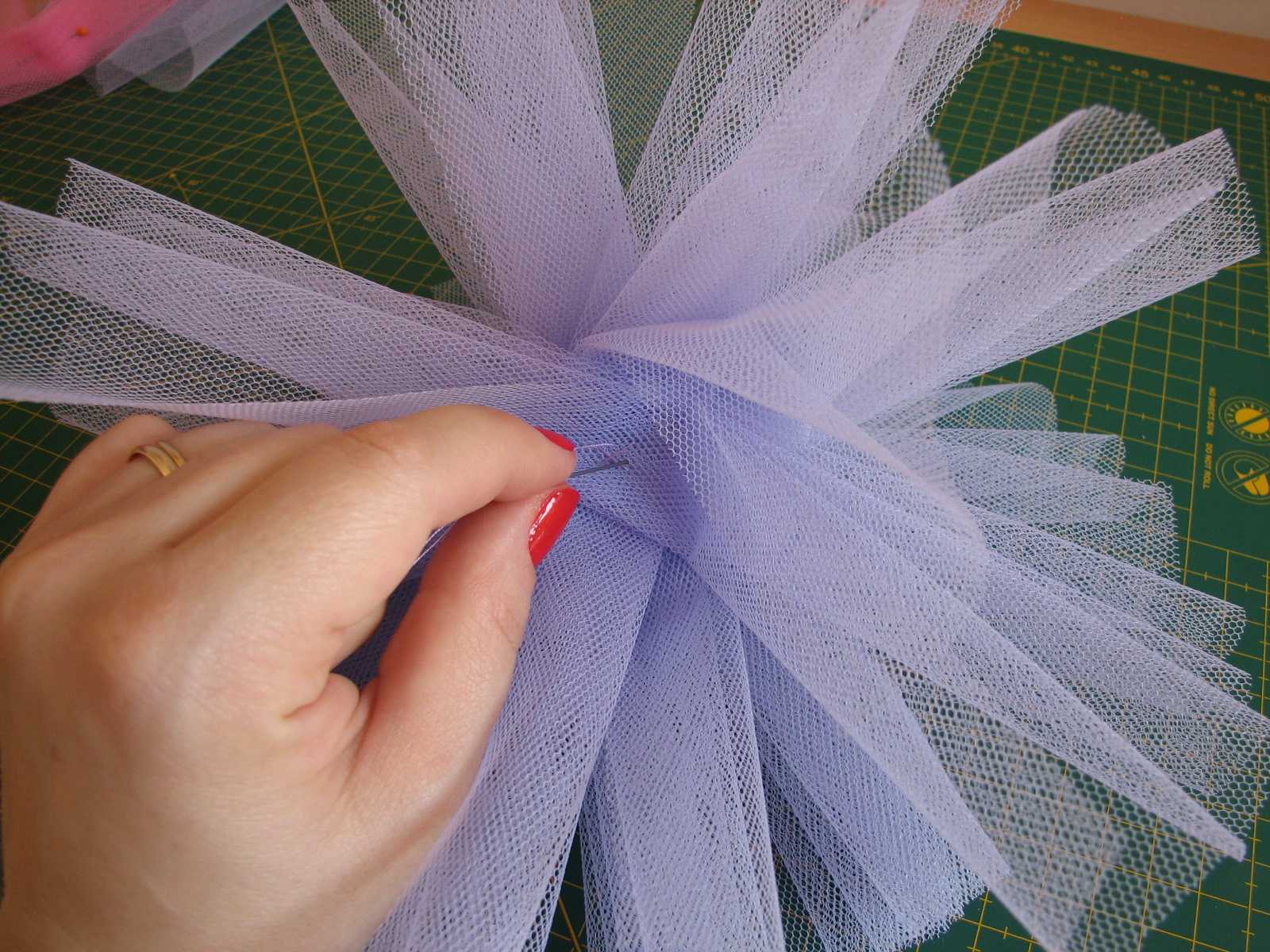 1- For every pompom cut eight squares of tulle 9.8’’ x 9.8’’. As it is difficult to mark in the tulle, I placed it on cutting mat to cut it. If you don’t have any, the best thing to draw on tulle is chalk.